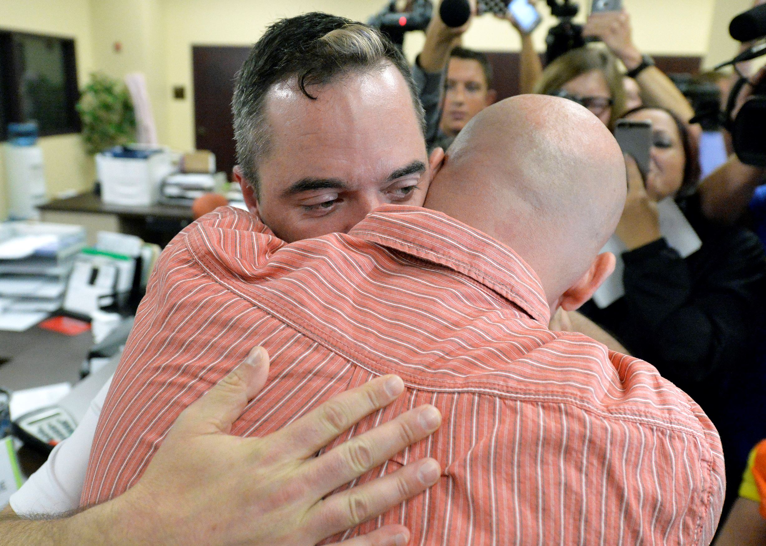 congratulating the couple and shaking their hands as he smiled. After they paid the license fee of $35.50, James Yates rushed across the steps of the courthouse to hug his mom as both cried.